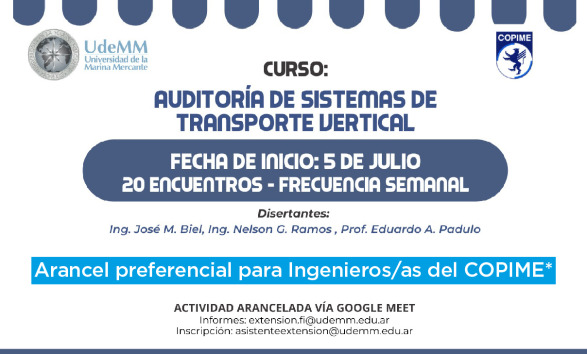 Tenemos el agrado de informar que, en el marco de un acuerdo entre la UdeMM y el COPIME, las y los profesionales matriculadas/os en nuestro Consejo gozarán de un descuento económico para participar en el Curso “AUDITORÍA DE SISTEMAS DE TRANSPORTE VERTICAL”, que inicia el 5 de julio de 2022.