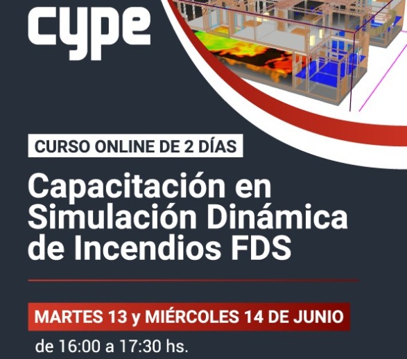La Junta Central de los Consejos Profesionales de Agrimensura, Arquitectura e Ingeniería invita a participar de la Capacitación online en "Simulación Dinámica de Incendios FDS" dictada por la empresa de software CYPE los días martes 13 y miércoles 14 de junio de 16 a 17:30 hs.