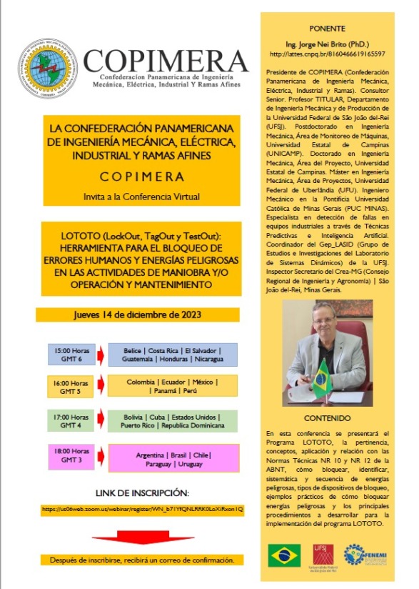 La Confederación Panamericana de Ingeniería Mecánica, Eléctrica, Industrial y ramas afines (COPIMERA) invita a la Conferencia Virtual "LOTOTO (LockOut, TagOut, TestOut): Herramienta para el Bloqueo de Errores Humanos y Energías Peligrosas en las Actividades de Maniobra y/o Operación y Mantenimiento". El evento se desarrollará en forma virtual el día Jueves 14 de diciembre de 2023 a las 18 hs.