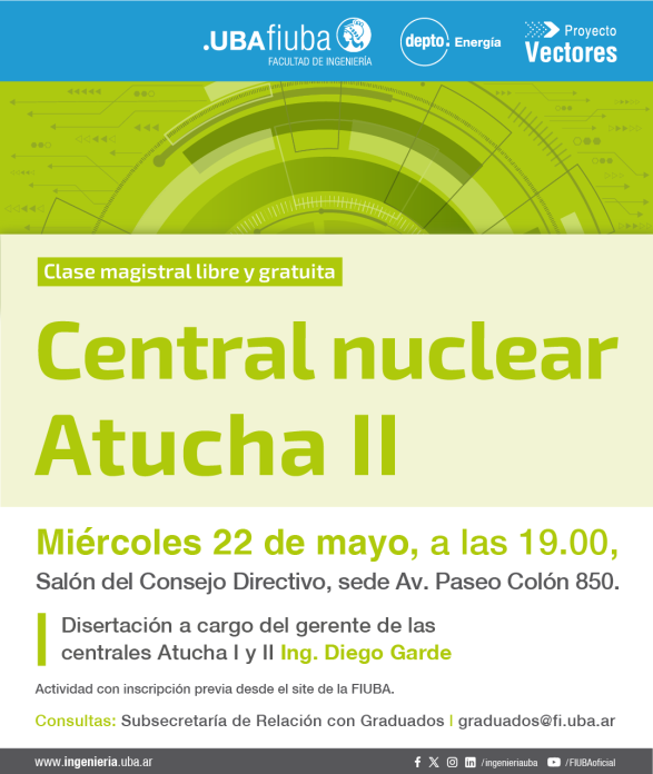 La Facultad de Ingeniería de la Universidad de Buenos Aires (FIUBA), en el marco del Posgrado en Energía Nuclear de la FIUBA y en articulación con el vector Nuclear del Proyecto Vectores, invita a participar de la segunda Clase Magistral: Reparación de la Central Nuclear Atucha II, a realizarse el miércoles 22 de mayo, de 19 a 21 hs, en el Salon del Consejo Directivo de la sede de Av. Paseo Colón 850, Ciudad Autónoma de Buenos Aires.