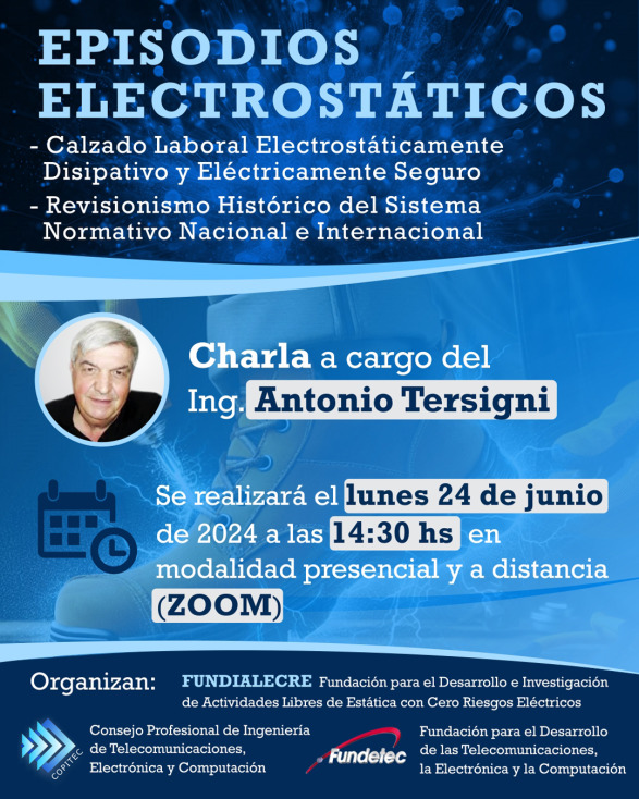El Consejo Profesional de Ingeniería de Telecomunicaciones, Electrónica y Computación (COPITEC), la Fundación para el Desarrollo de las Telecomunicaciones, la Electrónica y la Computación (FUNDETEC) y la Fundación para el Desarrollo e Investigación de Actividades Libres de Estática con Cero Riesgos Eléctricos (FUNDIALECRE), invitan a la charla “Episodios Electrostáticos: Calzado Laboral Electrostáticamente Disipativo y Eléctricamente Seguro y Revisionismo Histórico del Sistema Normativo Nacional e Internacional”, a celebrarse el lunes 24 de Junio, a las 14:30 hs, en las instalaciones del COPITEC - Perú 562 PB, CABA.