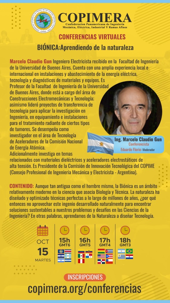 El disertante será el Ing. Marcelo Claudio Gun (Argentina) que nos ofrecerá el tema: “BIONICA, Aprendiendo de la naturaleza", donde se propone la asociación de la Biología y la Técnica, para encontrar soluciones sustentables a nuestros desafíos en la ingeniería.