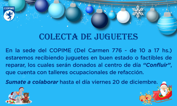 Se acerca Navidad y en el COPIME nos sumamos a la causa del Centro de Día "Confluir". Si tenés juguetes en buen estado o con algún detalle que pueda ser reparado, te invitamos a traerlos al Consejo: Pasaje Del Carmen 776 – CABA, de lunes a viernes de 10 a 17 hs.