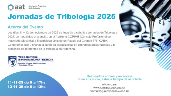 La Asociación Argentina de Tribología (AAT) invita a participar de las Jornadas de Tribología 2025 a realizarse los días martes 11 y miércoles 12 de noviembre de 2025 en la sede del COPIME, sita en Pasaje del Carmen 776, Ciudad Autónoma de Buenos Aires.
