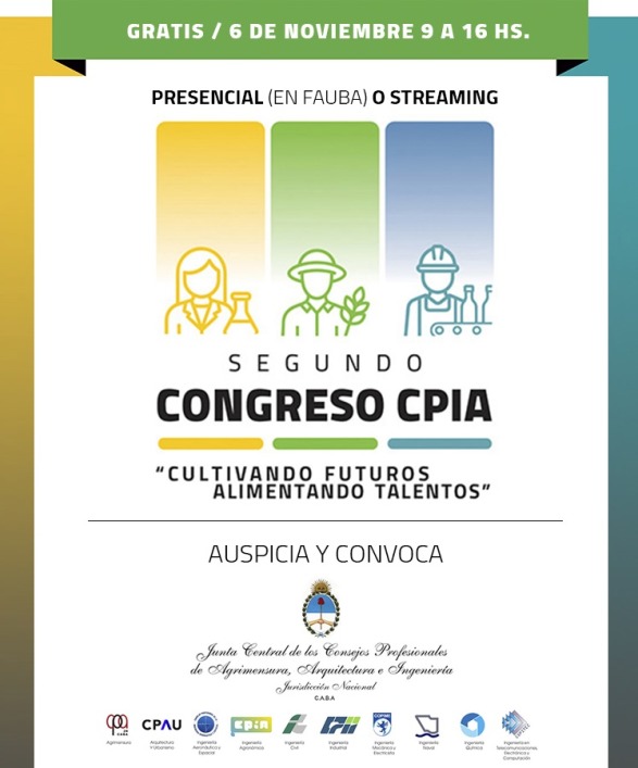 La Consejo Profesional de Ingeniería Agronómica (CPIA) invita al 2º Congreso CPIA "Cultivando futuros, alimentando talentos", a celebrarse el jueves 06 de noviembre, de 09 a 16 hs. en la Facultad de Agronomía de la Universidad de Buenos Aires (FAUBA): Av. San Martín 4453 - Ciudad Autónoma de Buenos Aires.