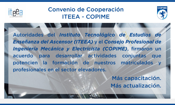 El pasado martes 24 de febrero, se concretó la firma de un Convenio de Cooperación entre las autoridades del Instituto Tecnológico de Estudios de Enseñanza del Ascensor (ITEEA) y este Consejo Profesional de Ingeniería Mecánica y Electricista (COPIME), con el objetivo de desarrollar actividades conjuntas de capacitación, formación profesional, actualización técnica y difusión científica, destinadas a los matriculados del COPIME, profesionales del sector y la comunidad en general.