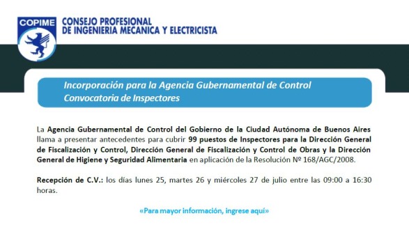 La Agencia Gubernamental de Control del Gobierno de la Ciudad Autónoma de Buenos Aires llama a presentar antecedentes para cubrir 99 puestos de Inspectores para la Dirección General de Fiscalización y Control, Dirección General de Fiscalización y Control de Obras y la Dirección General de Higiene y Seguridad Alimentaria en aplicación de la Resolución Nº 168/AGC/2008.